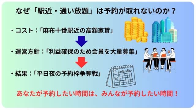 この会員詰め込み構造の結果、麻布十番駅近エリアの高額な家賃が、皮肉にも予約困難リスクの直接的な原因となってしまいます。
