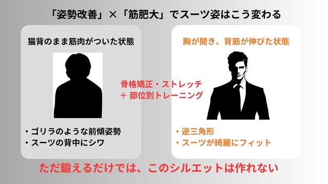 👉「姿勢改善」×「筋肥大」でスーツ姿はこう変わる