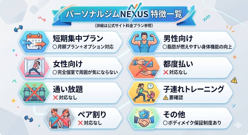 | 利用料金(例) | ■ライトコース(30分) 月4回:18,000円 月8回:32,800円 ■ベーシックコース(60分) 月4回:34,000円 月8回:64,800円 ※引用:パーソナルジムNEXUS |