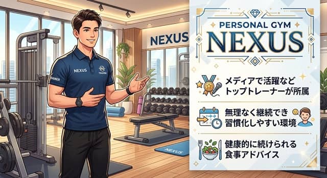 NEXUSが選ばれる理由は、メディアで活躍するトレーナーなど、トップレベルのトレーニング指導と食知識が習得できます。従って、運動がはじめての方や、続けられるか不安をもつ方でも、リラックスできる環境で運動を習慣化に期待ができます。