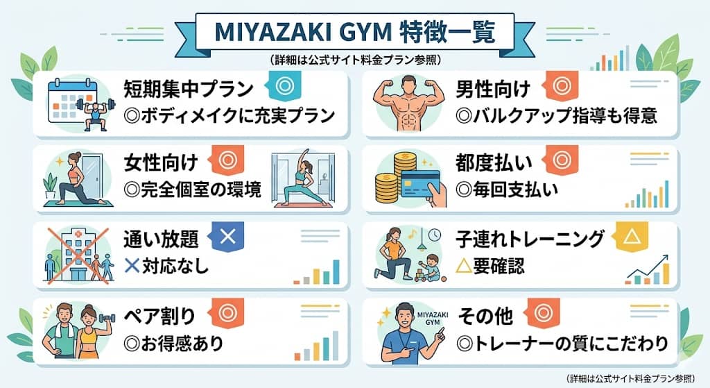 [図解:MIYAZAKI GYMのプラン一覧(7種類のプラン対応状況)]