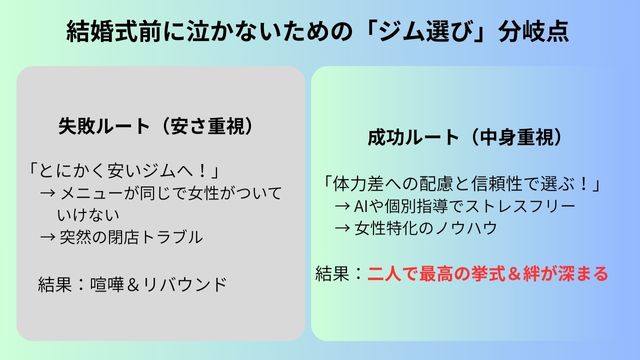結婚式という絶対に動かせない期限がある以上、信頼できる経営母体のジムを選ぶことが、リスクヘッジになります。