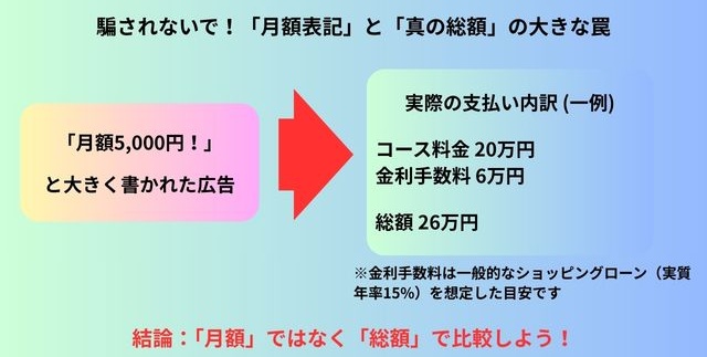 実はこれ、数十回の分割払いを組んだ場合の金額で、高額な手数料が上乗せされるケースがほとんどです。業界に15年いる私からすると、こうした「安く見せる手法」には強い危機感を覚えます。
