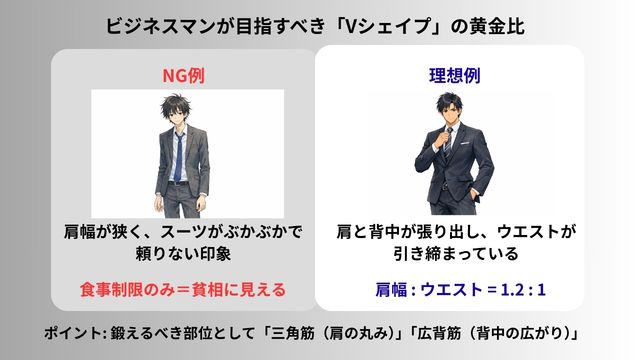 ビジネスマンが目指すべきゴールは、単に体重を落とすことではありません。食事制限だけで体重を落とすと、筋肉まで落ちてしまい、スーツを着た時に肩が落ち、貧相で頼りない印象を与えてしまうリスクがあります。