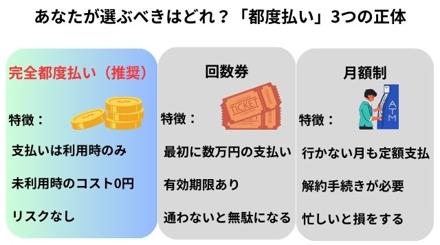 結論として、予定が読めないあなたが選ぶべきは、「完全都度払い」一択です。