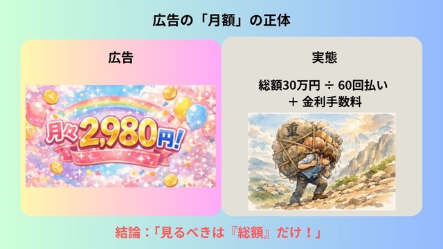 月額表記と総額表示は、広告上の見せかけと実際のコストという対立関係にあります。 賢いあなたは、必ず「総額」で判断してください。
