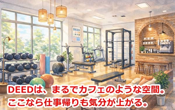「ジム通いを趣味にしたい」「おしゃれな空間でテンションを上げたい」 というあなたは、DEEDがおすすめです。心地よい空間は、忙しい日々のリフレッシュになります。