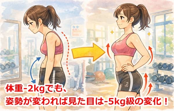 30代女性の多くが悩む「体重は減ったのに、お腹がぽっこり出たまま」「二の腕がたるんでいる」という現象。これは、猫背や巻き肩といった「姿勢の悪さ」が原因であることがほとんどです。ASPIのメソッドは、骨格レベルでアプローチ(姿勢改善)するため、体重が落ちるよりも先に、見た目のシルエットが劇的に美しくなります。
