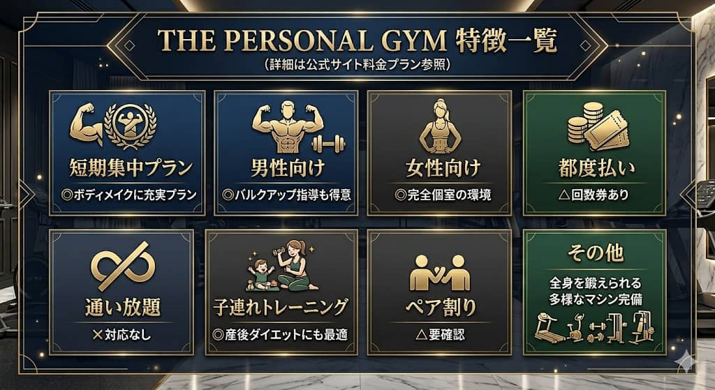 [図解:THE PERSONAL GYMのプラン一覧(7種類のプラン対応状況)]