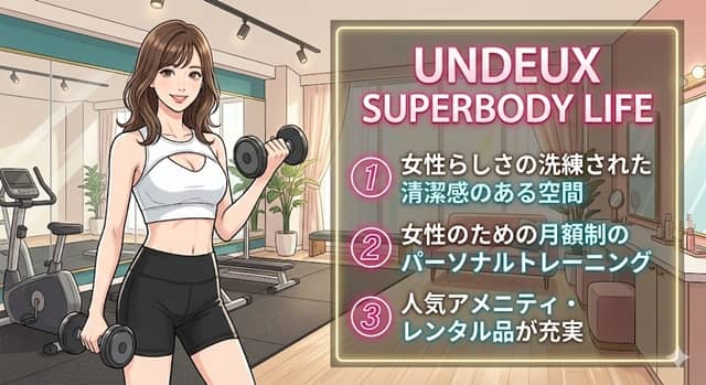 UNDEUX SUPERBODY LIFEは、通いやすい月額料金で、女性に特化したダイエットやボディメイクに期待がもてます。