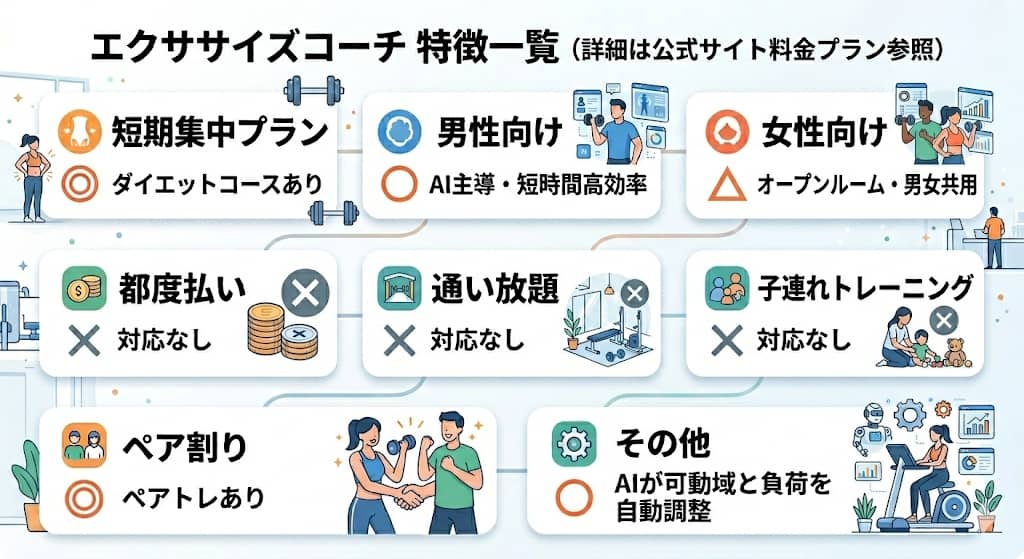 なお、エクササイズコーチのプラン特徴は、次の図解を確認してください。