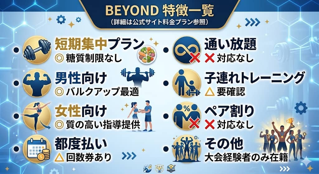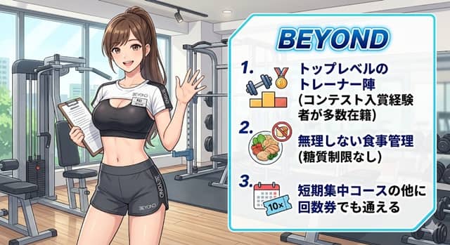 BEYONDは、業界大手の一つで、実力のあるトレーナーと無理しない食事管理が強みで、あなたの悩みにあった指導に期待がもてます。