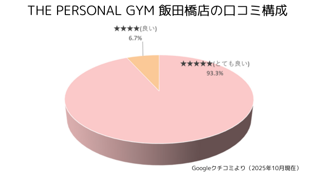 THE PERSONAL GYM 飯田橋店に寄せられたGoogleクチコミ全15件を確認したところ、口コミの評価は以下のような分布になっていました。