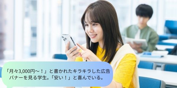 「月々3,000円〜」という広告を見て、「これなら私でも払える!」と飛びつこうとしていませんか?ちょっと待ってください。その安さには、学生が陥りやすい大きな落とし穴があります。
