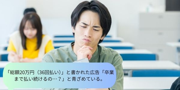 - 事例②「総額20万円(36回払い)」の広告で青ざめる学生