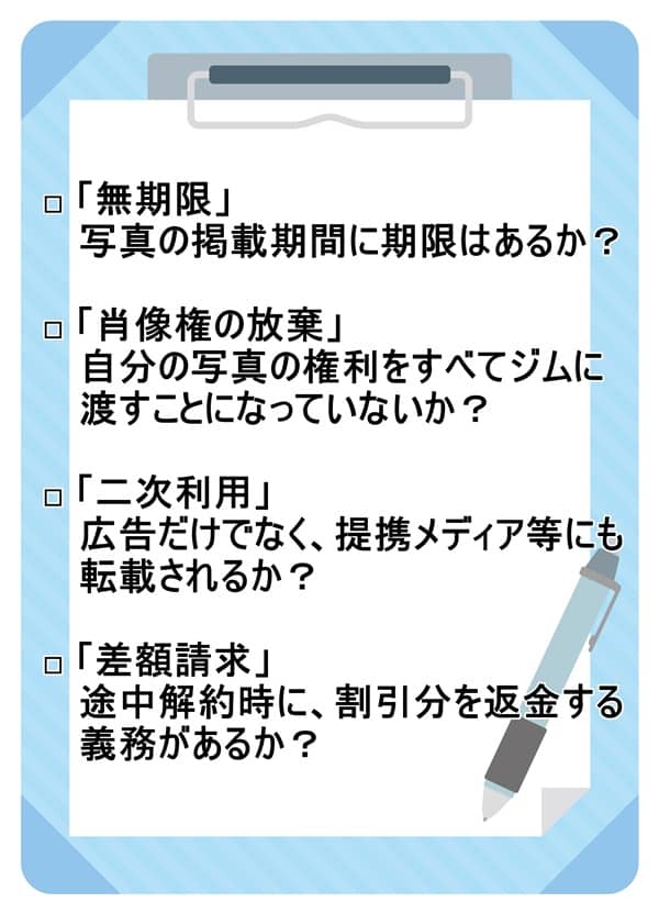 最も安全なのは、「掲載期間を1年間に限定する」といった覚書を交わすことですが、大手ジムでは対応してくれないことも多いのが現実です。