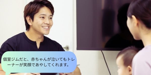 完全個室のジムでは、赤ちゃんが泣いてもトレーナーが笑顔であやしてくれるのでトレーニングに集中できます。