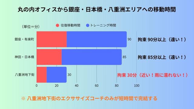 なぜなら、多くのメディアが紹介する「東京駅周辺」のジムは、実際には銀座、有楽町、神田、日本橋に位置しているからです。丸の内や大手町のオフィスから、これらのエリアまで移動するのにどれくらいの時間がかかるか、シミュレーションしたことはありますか?