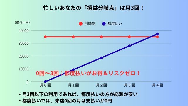 この2つを比較した時、経済的な「損益分岐点」は「月3回」になります。